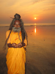 un des disciples et un Baba en pleine prière du coucher du soleil sur la plage les instruments de culte pour la prière du coucher du soleil (regardez mon réveil matin, le coquillage troué)
